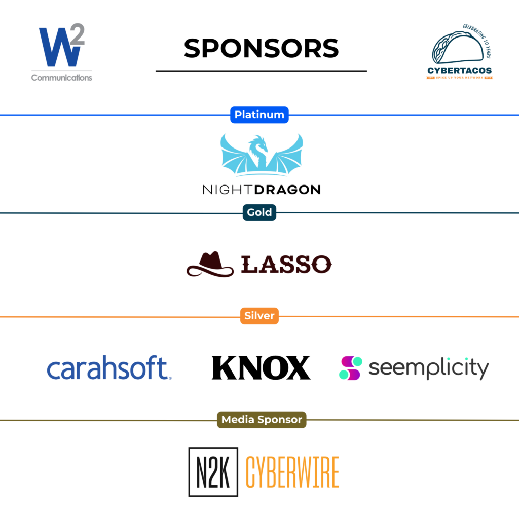 CYBERTACOS is a creative opportunity to place yourself in front of key executives and prospective partners across the cybersecurity community. We offer a range of sponsorships that offer a variety of benefits.