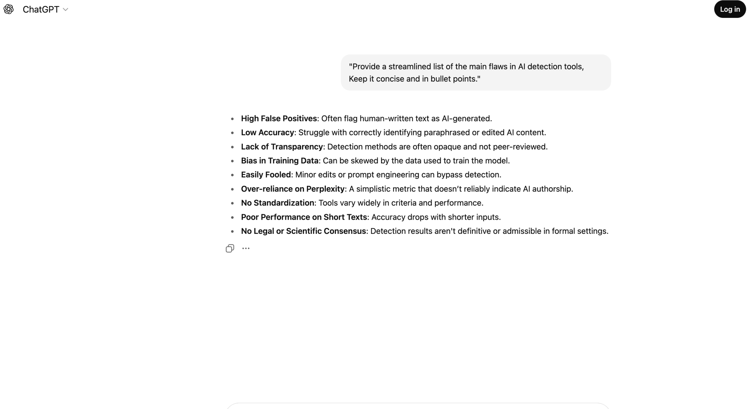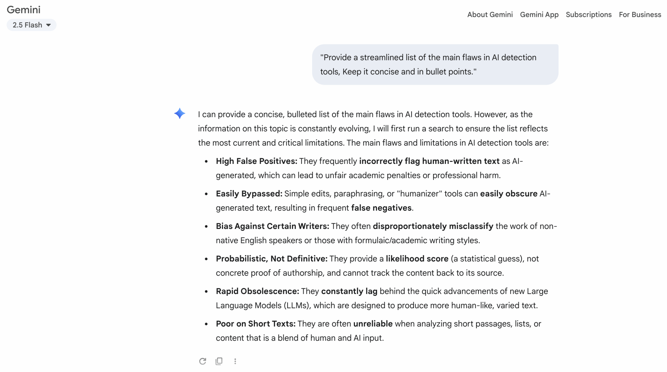 While putting this blog together, I also asked AI to explain the flaws of these detection tools. The response was almost identical to what I had already experienced myself: bias, inaccuracies and inconsistent logic. Even the technology admitted the same gaps we already see in practice.